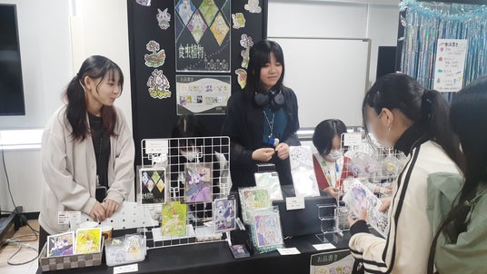 グッズ販売ブースでは、イラストなどを学ぶ専攻の学生が手描きのポストカードやオリジナル缶バッジを販売。デザイン性の高い作品は多くの来場者の方にお求めいただきました。