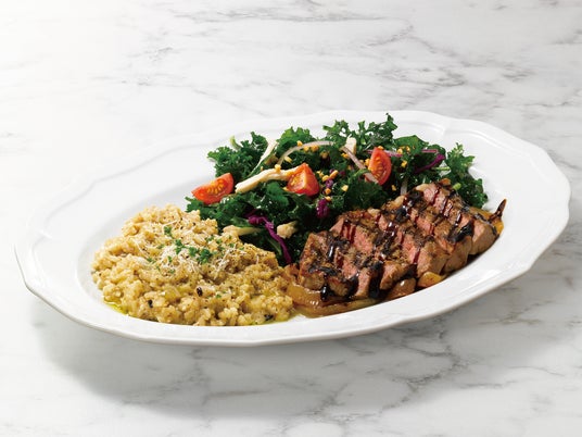 アンガスサーロインステーキとケールサラダ、自社のセントラルキッチンで製造する芳醇なポルチーニクリームを合わせたリゾット仕立てを一皿に。店舗で仕上げるリゾット仕立ては、カリフラワーライスと雑穀米を使用し、軽やかな食感と豊かな風味をお楽しみいただけます。また、グリルドオニオンとバルサミコソースのコクが、ステーキの旨みを引き立てます。