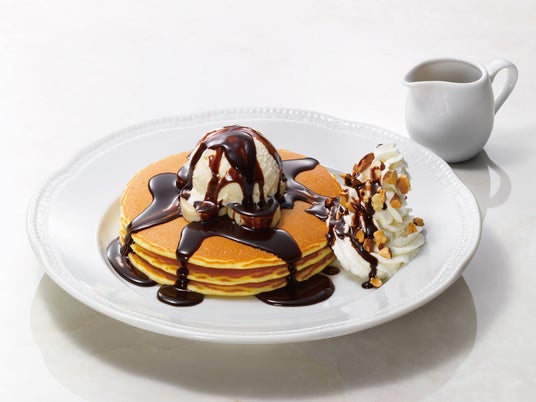 ご注文をいただいてから焼き上げるロイヤル伝統のパンケーキにバニラアイスクリームを乗せ、ホイップクリームを添えました。ロイヤルホスト定番の「ホットファッジサンデー」でおなじみの温かいチョコレートソースをかけてお召し上がりください。