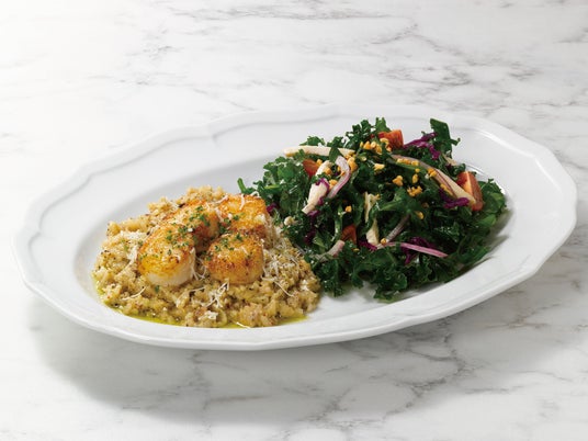 香ばしくグリルした北海道産帆立の貝柱と、自社のセントラルキッチンで製造する芳醇なポルチーニクリームを合わせたリゾット仕立てをご 一緒に。店舗で仕上げるリゾット仕立ては、カリフラワーライスと雑穀米を使用し、軽やかな食感と豊かな風味をお楽しみいただけます。彩りを添えるケールサラダとともに、満足感のある一品に仕上げました。