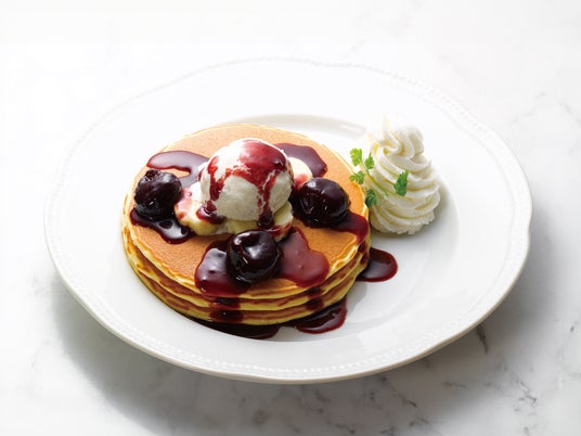 ロイヤル伝統のパンケーキを、シナモンなどのスパイスが香るほどよく温めたチェリージュビリー風ソースとバニラアイスクリーム、ホイップクリームと一緒にお楽しみください。