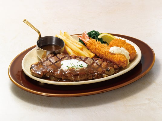 アンガスサーロインステーキと一緒に、天然海老フライと紅ずわい蟹を使用したクリームコロッケを盛り合わせました。ソースは、ドミグラスバターソース、ガーリッククリームソース、おろしゆずぽん酢ソースからお選びいただけます。