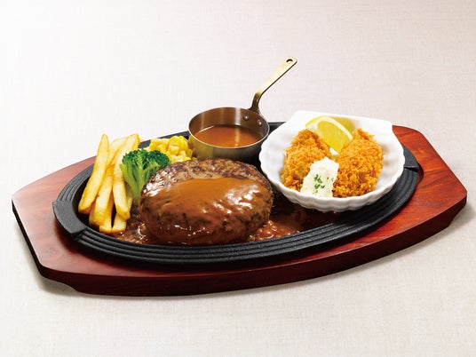 ロイヤルホスト定番の黒×黒ハンバーグ(190g)とジューシーな牡蠣フライを盛り合わせました。素材の味をしっかりと感じられる牡蠣フライを、タルタルソースやレモンと一緒にお楽しみください。また、MSC 認証の岡山県邑久町虫明産の牡蠣を使用しています。