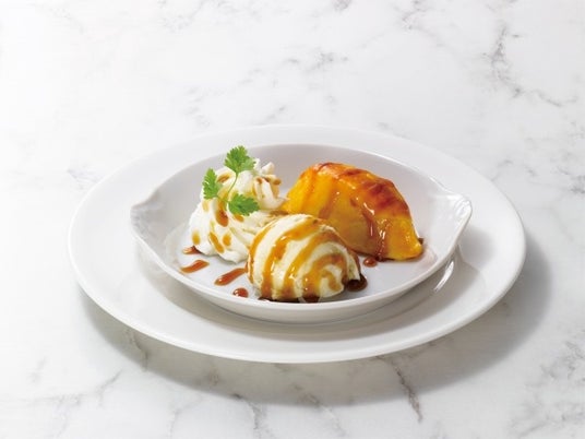 温かいチェリーにキルシュやブランデーなどのリキュールを加えてフランベし、バニラアイスクリームにかけて仕上げる、伝統的なデザートです。ロイヤルホストでは、多くのお客様にお楽しみいただけるよう、アルコールを使用せず、リキュールを思わせる香りをシナモンなどのスパイスで表現したチェリーソースで提供します。