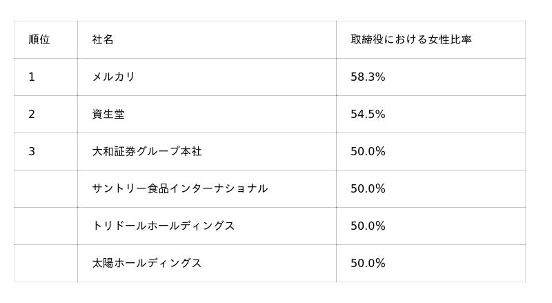 1位はメルカリ。取締役総数が24年の10人から25年は12人へと増えた中で、3人だった女性取締役が7人に増え、女性比率は30.0%から58.3%と約28ポイントの上昇。なお7人のうち社内取締役は2人、社外取締役は5人だった。