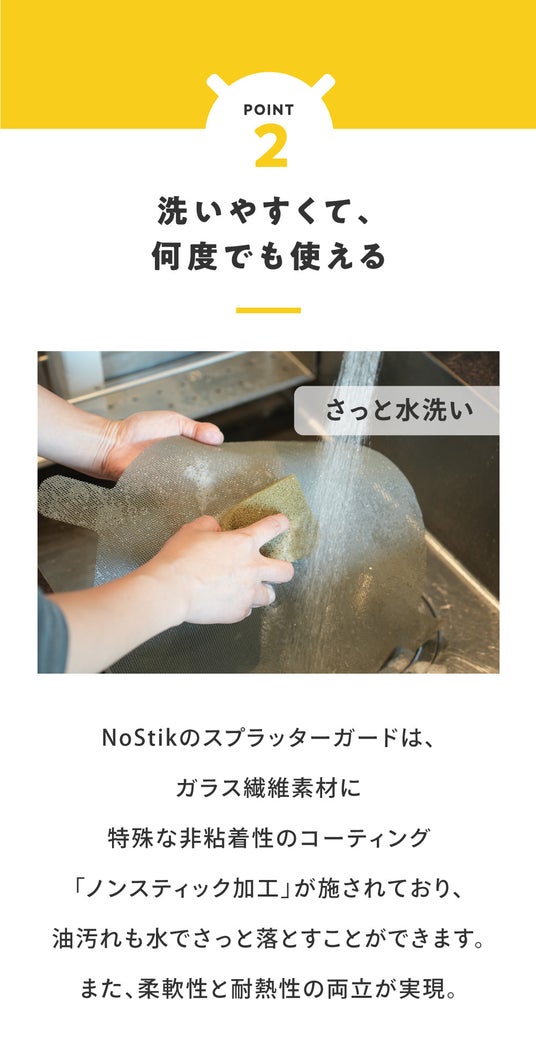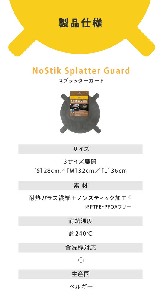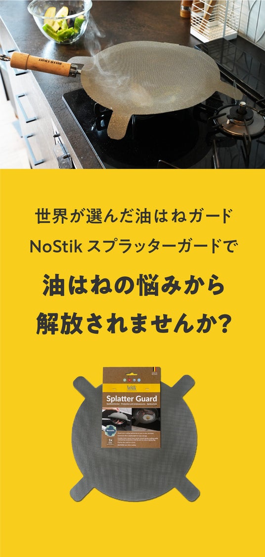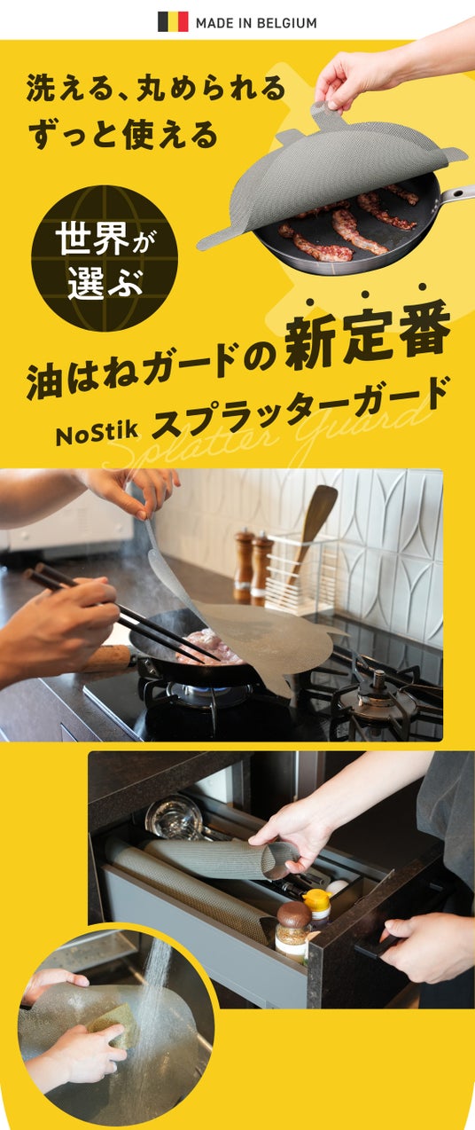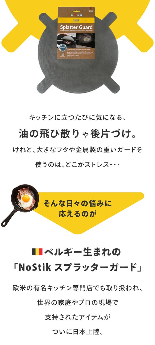 ベルギーのNoStik社が製造するこのスプラッターガードは、ヨーロッパ、アメリカ、オーストラリアなど世界中の家庭で愛用されており、品質と利便性の両面で高い評価を得ています。