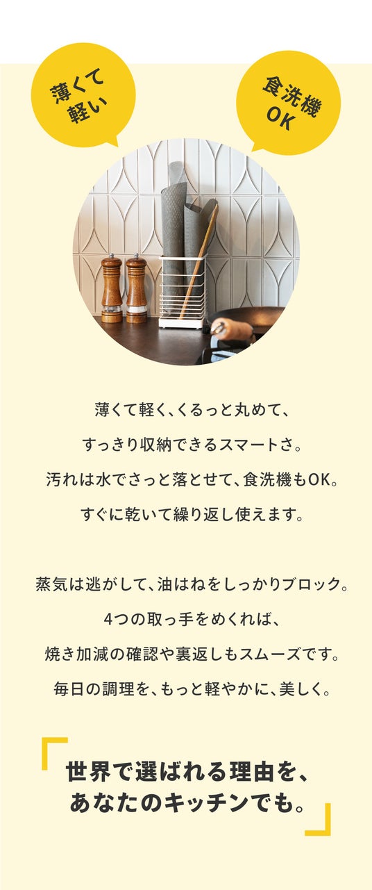 蒸気は逃して香ばしく、油はねをしっかりガード。調理の質を落とさず、丸めてすっきり収納。