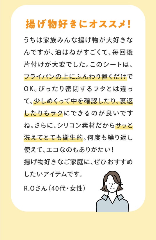 そんな中、この商品と出会い、「調理中の油ハネをここまでしっかり防ぎ、しかも軽くて洗って繰り返し使えるなんて!」と感動したのを今でも覚えています。