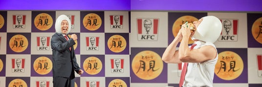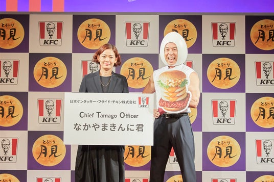 発表会では、今年のKFCが展開する「人類たまご化計画」のコンセプトムービーを放映。映像が終了すると、CTOにふさわしい「たまごの被り物」を身に着けたなかやまきんに君がお馴染みの「ヤー!!」の掛け声で登場。1週間前から考えた"たまご"あるあるを披露すると会場の笑いを誘いました。なかやまきんに君鉄板の筋肉ルーレットの後にトリプル月見バーガーを実食。ふんわり目玉焼き風オムレツが3つ積み上がったトリプル月見バーガーの大きさに悪戦苦闘しながらも「たまご好きの僕には最高にしあわせ!」とそのおいしさを語り、最後には「とろ~り3倍!おいしさ100倍!パワー!」となかやまきんに君節全開で会場を盛り上げました。