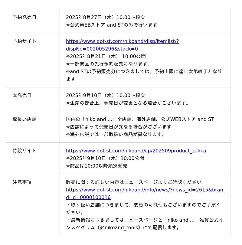 また、2025 年 8 月21日(木)10時より「niko and ...」の公式WEBストア and STにて、本コラボレーションの一部商品を先行公開いたします。