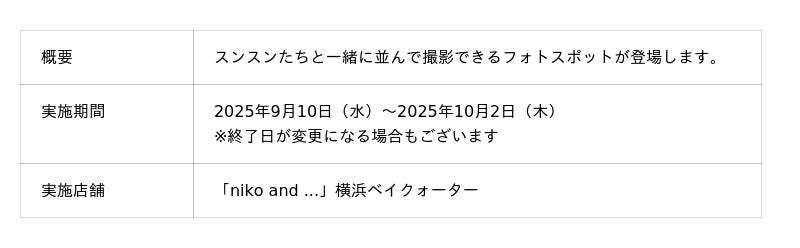 株式会社アダストリア(本部:東京都渋谷区渋谷2-21-1、代表取締役社長:木村 治)が展開するスタイルエディトリアルブランド「niko and ...(ニコアンド)」は、SNS で人気沸騰中のキャラクター「パペットスンスン」とのコラボレーションアイテムの一部商品を、2025 年8 月27 日(水)より「niko and ...」公式WEB ストア and ST(アンドエスティ)にて先行予約販売いたします。本発売は2025 年9 月10日(水)からを予定しており、全国の「niko and ...」の店舗にて、コラボアイテムを税込み3,300 円以上ご購入いただいた方に先着で、コラボレーション限定デザインのステッカープレゼントや、「niko and ...」の一部大型店にて期間限定でコラボレーション限定アートが入ったレシート写真機を体験できるキャンペーンを実施します。さらに「niko and ...」横浜ベイクォーター店には、スンスンたちと一緒に写真が撮れるフォトスポットが登場します。