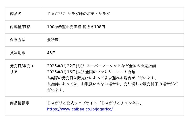 カルビー株式会社(本社:東京都千代田区、代表取締役社長兼CEO:江原 信、以下カルビー)は、食品総合卸の株式会社日本アクセス(本社:東京都品川区、代表取締役社長 社長執行役員 CEO:服部 真也、以下日本アクセス)と、この度「じゃがりこ」ブランド初となるチルド惣菜『じゃがりこ サラダ味のポテトサラダ』を共同開発しました。この商品を、日本アクセスが販売元となり2025年9月22日(月)から全国の小売店舗で発売します。全国のファミリーマート店舗で同年9月16日(火)から先行発売します。