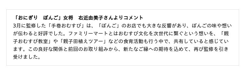 株式会社ファミリーマート(本社:東京都港区、代表取締役社長:細見研介)は、継続して取り組んでいる5つのキーワードのうち「もっと美味しく」「『あなた』のうれしい」の一環として、2つの名店監修による本格的なおむすびを発売いたします。