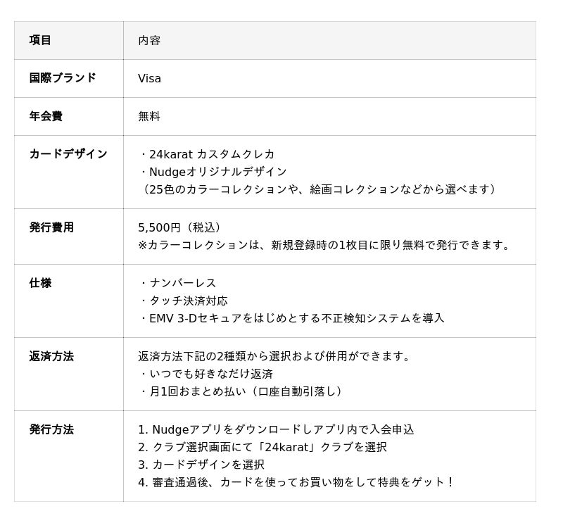 ナッジカードアプリから「24karat」クラブに入会し、本カードを月に50,000円以上ご利用いただくと、専用アプリ「24kZAP」上で様々な用途に利用できる「24karat クレカポイント」(500pt分)を提供します。