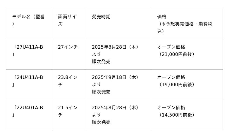 LGエレクトロニクス・ジャパン株式会社(代表取締役:孫 成周(ソン・ソンジュウ) 本社:東京都中央区)は、フルHDモニターの新モデルとして、27インチの「27U411A-B」と21.5インチの「22U401A-B」を2025年8月28日(木)より、23.8インチの「24U411A-B」を2025年9月18日(木)より順次発売します。