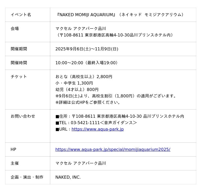 株式会社ネイキッド(英語表記:NAKED, INC. 所在地:東京都渋谷区、代表:村松亮太郎)は、マクセル アクアパーク品川にて、2025年9月6日(土)~11月9日(日)までの期間、「超・没入型」のプログラムに進化したナイトドルフィンパフォーマンスと共に秋限定イベント『NAKED MOMIJI AQUARIUM』の企画・演出・制作を手がけています。