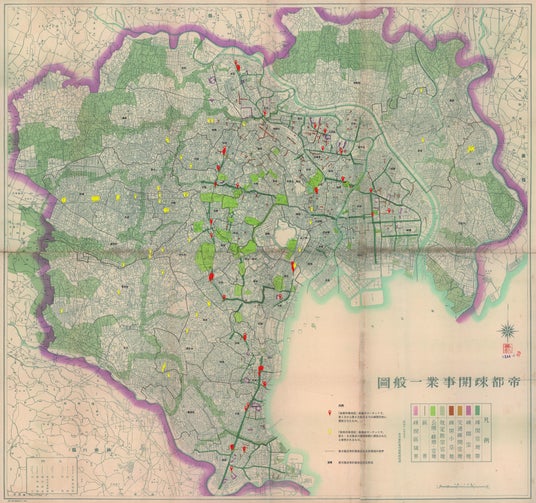 1)東京23区内の建物疎開跡地に形成されたマーケットの分布(「帝都疎開事業一般図」1944年に2025年加筆)