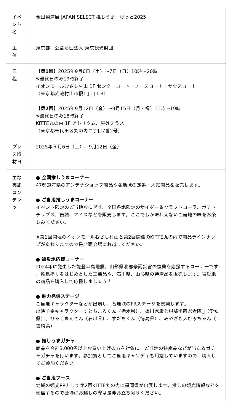 東京都及び公益財団法人 東京観光財団が主催し、第1回は2025年9月6日(土)~7日(日)の2日間、イオンモールむさし村山、第2回は、9月12日(金)~15日(月・祝)の4日間、KITTE丸の内にて開催いたします。本イベントは、全国のアンテナショップ等と連携し、日本全国の"イチ推し"の美味しい特産品を集め、食を通じて47都道府県の魅力を感じていただき、来場者皆様の"推し"を見つけていただくイベントです。