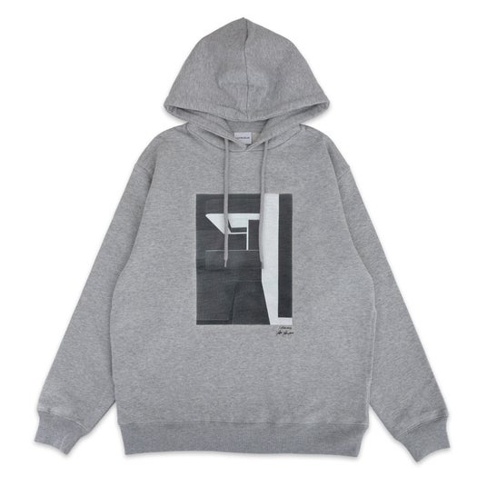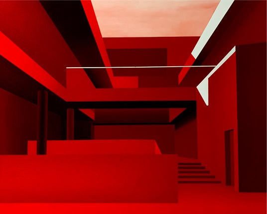 ワントーンで描くからこそできる表現の発端は木炭デッサンだ。今でも油彩とデッサンは表裏一体であり、色相ではなく明度で絵を捉え、白の絵の具はほとんど使わない。当初は古典的なカマイユ技法のように茶褐色のワントーンで描いていたが、次第に赤茶、最終的には真っ赤に変化した。昔から黒・白と同じくらい私にとって普遍的な色が赤だったため、その移り変わりはほとんど無意識に近い。火や情熱を想起させ熱いイメージのある赤は、私の中で、そして私の絵の上で、冷たく無機的な色である。なんとなく心地いいコントラスト、図形として綺麗な形。その表現とビジュアルを支える、多くは語らない無臭の赤。
