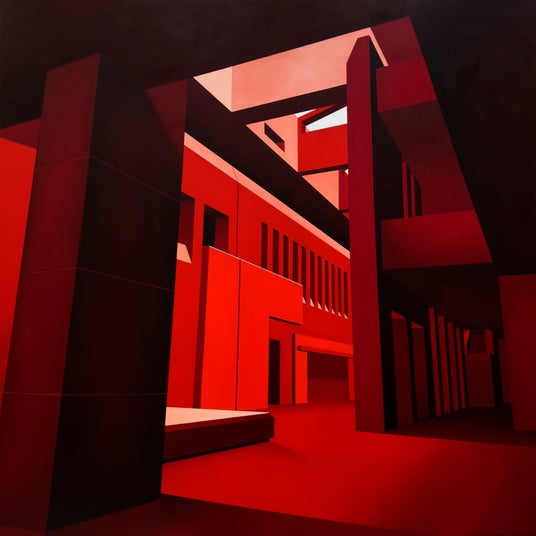 本展で描かれるモチーフは、作家自身が強く惹かれる素材や形に基づいており、対象に向けられた繊細な感受性と抽象的な構成が交差することで、具象と抽象のあいだを行き来するような視覚体験が生まれます。さらに、画面を特徴づけるのは、無機質に研ぎ澄まされた赤の色調と、その上に揺らめく重層的なグラデーションです。静謐な赤の響きと層の気配が、作品全体に深い余韻と緊張をもたらします。