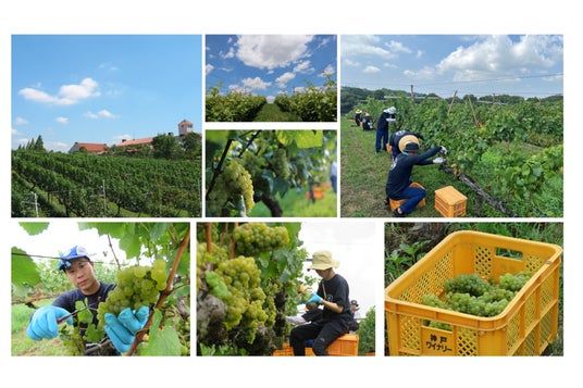 神戸ワイナリーの圃場に広がるぶどう畑と収穫風景