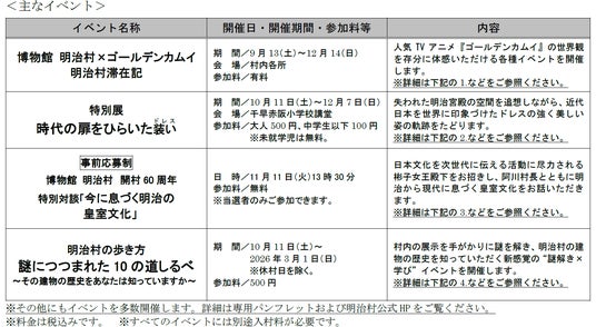 博物館 明治村(犬山市内山1番地、理事長:高崎 裕樹)では、9月13日(土)から12月14日(日)までの期間、秋催事として、人気TVアニメ『ゴールデンカムイ』(以下、『ゴールデンカムイ』)とのコラボイベント「博物館 明治村×ゴールデンカムイ 明治村滞在記」をはじめ、各種イベントを開催します。