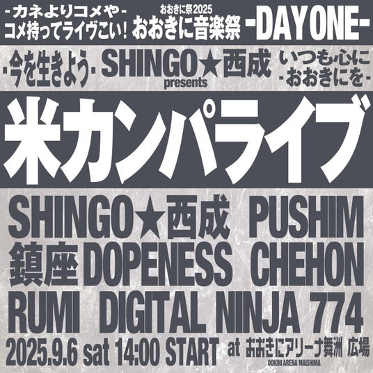 9月6日(土)はSHINGO★西成presents【米カンパライブ】!7日(日)はMicro(Def Tech)、ベリーグッドマンを中心とした豪華アーティスト陣でお届け♪入場・閲覧無料!