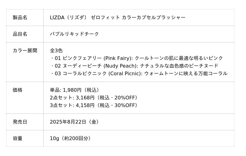 今回の「ゼロフィット カラーカプセルブラッシャー」は、カバー力で「隠す」のではなく、素肌感を活かして「見せる」血色感を求める声に応えて開発された、LIZDAの思想を最も体現する製品です。