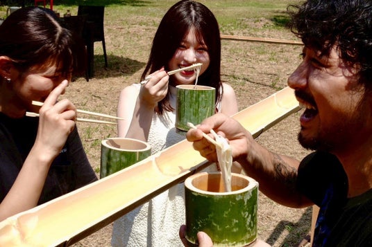大自然に囲まれた空間で体験するそうめん流しは、普段とはひと味違う開放感と涼しさを届けます。9月末までの期間限定です。