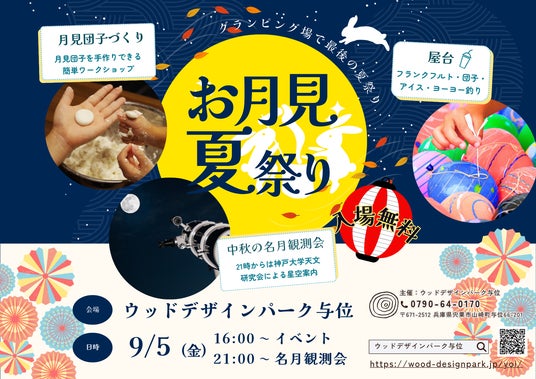 ウッドデザインパーク与位では、9月5日にお月見夏祭り&中秋の名月観望会を開催いたします。当日は、お月見団子を作るワークショップや炭火焼きの香ばしいフランクフルトなどをご用意。
