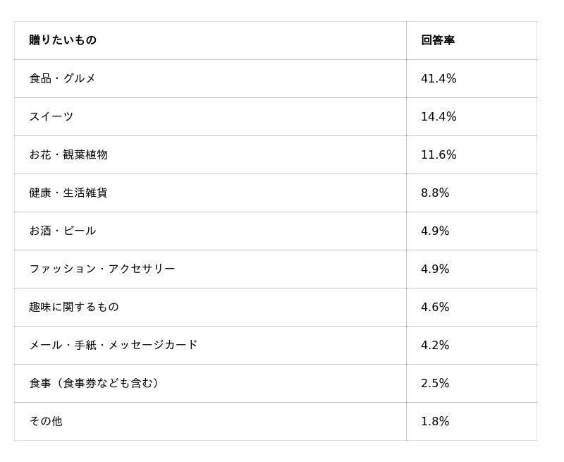 一方で、「健康・生活雑貨」が8.8%や「趣味に関するもの」が4.6%といった"実用性"や"個人の楽しみ"に寄り添う品も選ばれており、相手のライフスタイルや好みに配慮したギフト選びを心がけている様子も感じられます。