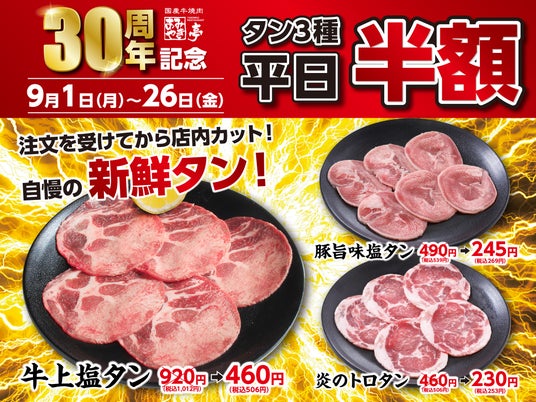 株式会社あみやき亭(本社:愛知県春日井市)はあみやき亭東海エリア全店で2025年9月1日(月)から9月26日(金)までの平日(月~金※祝日は除く)限定で、タン好き必見の「タン半額フェア」を開催します。