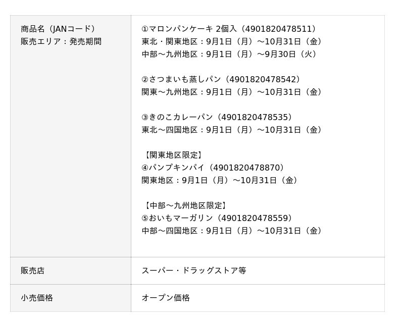 敷島製パン株式会社(Pasco)は、秋の味覚が楽しめる"秋の味覚マルシェ"として「マロンパンケーキ」、「さつまいも蒸しパン」、「きのこカレーパン」、「パンプキンパイ」、「おいもマーガリン」の5アイテムを、2025年9月1日(月)から期間限定で東北、関東、中部、関西、中国、四国、九州地区にて発売します。(※)