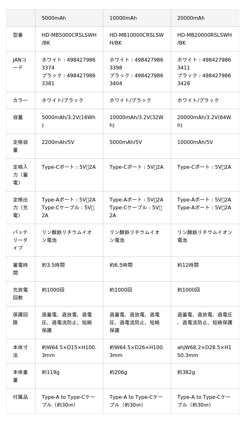 ◎用途に合わせて選べる3つの容量…5000mAh/10000mAh/20000mAh