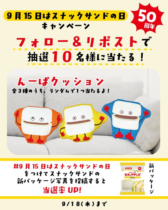 50周年を記念して、フジパン公式Xアカウント(https://x.com/neobata_fujipan)では、フォロー&リポストで参加できる「9月15日はスナックサンドの日キャンペーン」を実施いたします。