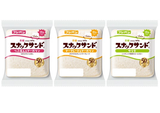 フジパン株式会社(愛知県名古屋市)で発売している日本初の携帯サンドイッチの『スナックサンド』が、2025年9月15日で発売50周年を迎えます。50周年を記念し、9月1日(月)より、スナックサンド全品のパッケージがリニューアルします。また、同日より発売初期のスナックサンドの味わいを復刻し、現代の味わいにアレンジした商品を期間限定発売いたします。さらに『スナックサンド こだわりビーフカレー』を増量いたします。50周年を迎えるスナックサンドに乞うご期待ください。