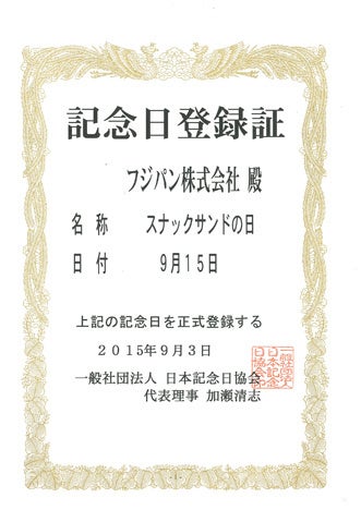 2015年には発売40周年を記念して、一般社団法人日本記念日協会が登録する記念日として、発売日にあたる9月15日を「スナックサンドの日」として認定。(2015年9月3日登録)また、2016年には、スナックサンドのキャラクター「はさみちゃん」「んーぱ」を登場させるなど、スナックサンドの魅力を発信し続けています。