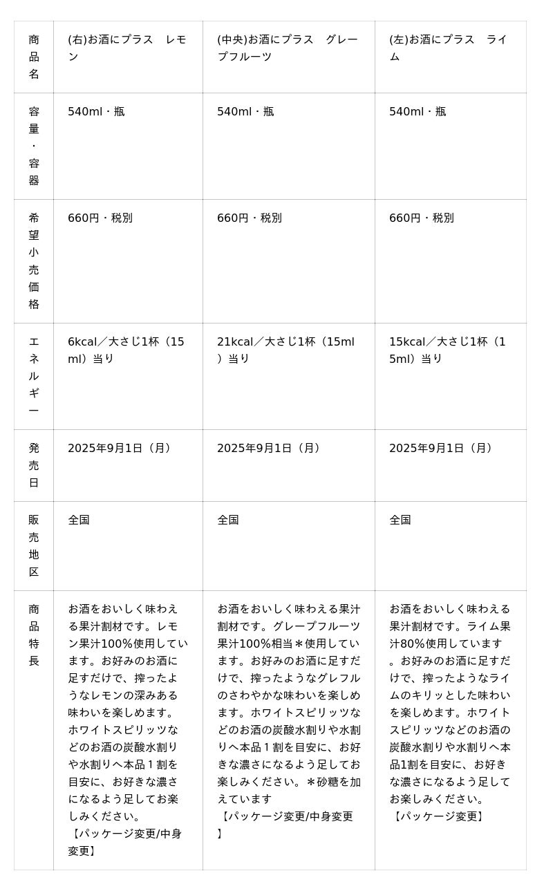 「お酒にプラス」ブランドは、お酒のおいしさを引き立てながらも、果汁の味わいをしっかり体感できるよう、果汁の香り立ちや酸味・甘味のバランスを追求し「お酒をおいしく味わえるお酒専用の果汁割材」として、お酒の自由な飲み方を提案していきます。