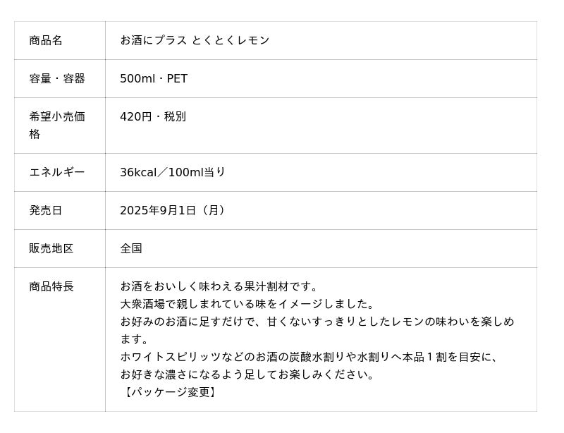 - 「お酒にプラス とくとくレモン」…甘くないすっきりとしたレモン味で、お酒に合わせるとレモンのビターな味わい