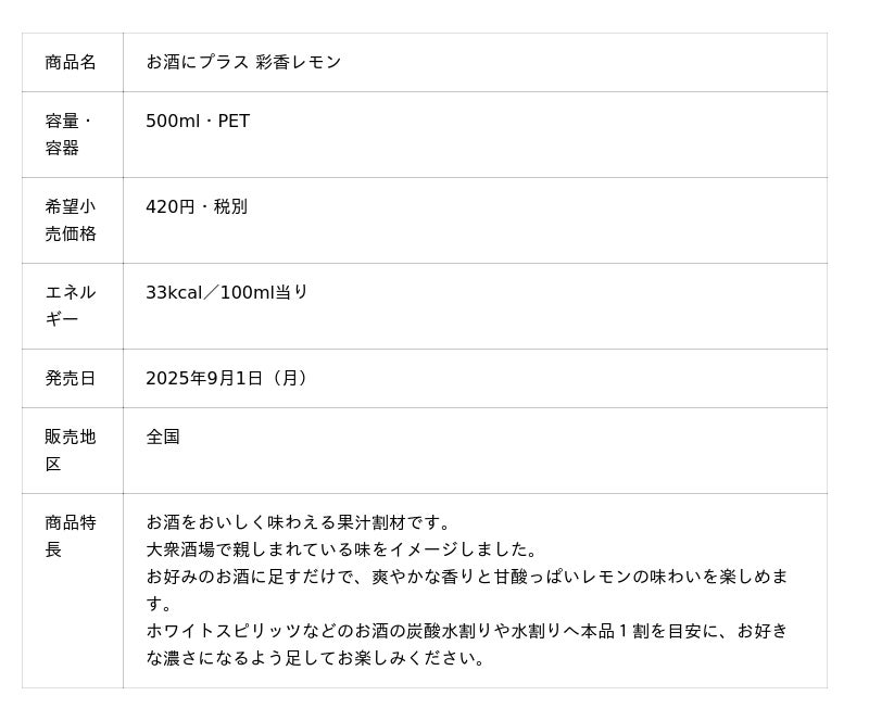 - ・お酒にプラス 彩香レモン」…香り立ちよくしっかり甘さのある濃いレモン味で、お酒ならではの苦みをカバーしながらレモンの甘酸っぱさ