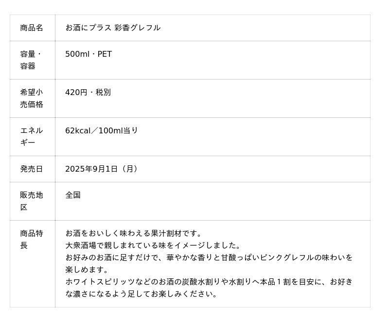 現在販売しているPETボトルの「お酒にプラス とくとくレモン」がウイスキーやジン、ビールなどあらゆるお酒の割材として飲用されている実態を踏まえ、このたび、ジンやラムなど洋酒との相性を考え抜いた「お酒にプラス 彩香レモン」、「お酒にプラス 彩香グレフル」を新たに発売します。香り立ちがよくしっかりとした甘さのある味わいが特長で、「いろいろなお酒と合わせて多彩なアレンジが楽しめる」という意味を込めて「彩香(サイコー)」と名付けました。