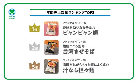 「香酢が効いた旨辛たれビャンビャン麺」が「ファミマルKITCHEN」の辛旨冷凍食品のカテゴリの年間売上数量で1位でした。本商品は2024年10月に発売された商品のため、発売から1年未満で年間1位を獲得したことになります。