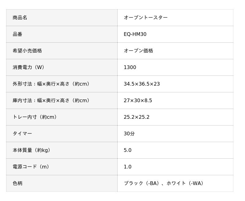 オーブントースター(EQ-HM30)ホワイト(-WA)