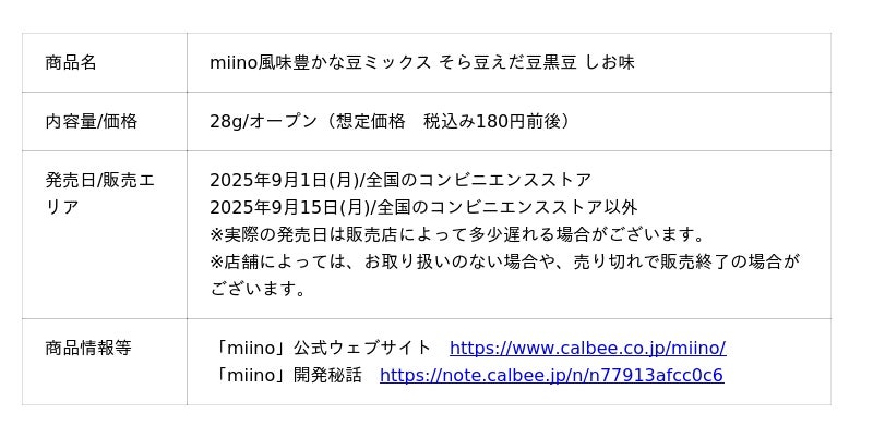 カルビー株式会社(本社:東京都千代田区、代表取締役社長兼CEO:江原 信)は、豆まるごとのおいしさを、いつでもどこでも楽しめる「miino(ミーノ)」シリーズより、素揚げした豆3種類をミックスした新商品『miino風味豊かな豆ミックス そら豆えだ豆黒豆 しお味』を2025年9月1日(月)から、全国のコンビニエンスストア先行で期間限定発売します。コンビニエンスストア以外の店舗では、2025年9月15日(月)から期間限定発売します(2026年4月上旬終売予定)。