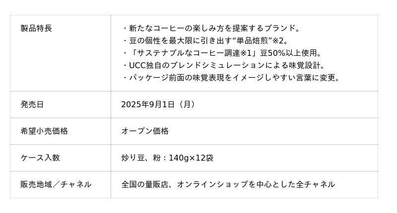 また、UCCが長年培ってきた技術の集大成として、「独自のロースティング」技術を活かした、産地や銘柄によって異なる豆本来の持ち味を最大限に引き出す「単品焙煎※2」という手法と、UCCに長年蓄積されたブレンドデータにより、コク・苦味・酸味だけでは語れない特別な味わいを実現しています。