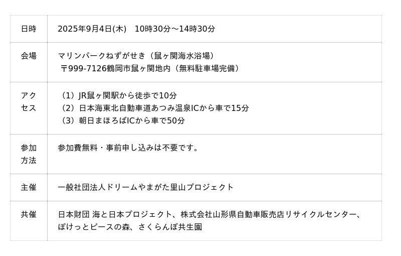 一般社団法人 ドリームやまがた里山プロジェクトは、2025年9月4日(木)に「ユニバーサルビーチinマリンパークねずがせき」を開催いたします。障がい者も健常者も一緒に楽しむことができるイベントです。