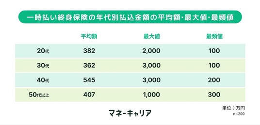 <一時払い終身保険の年代別払込平均額・最大値・最頻値>