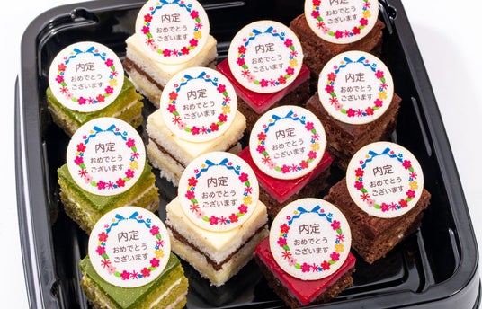 「内定おめでとうございます」のメッセージが入った4種(ガトーショコラ、カシスショコラ、ホワイトオペラ、抹茶オペラ)のフィンガーケーキセット