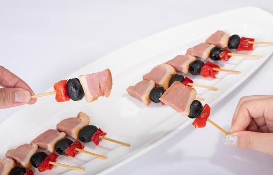 - 合鴨スモークとオリーブと赤ピーマンのピンチョス