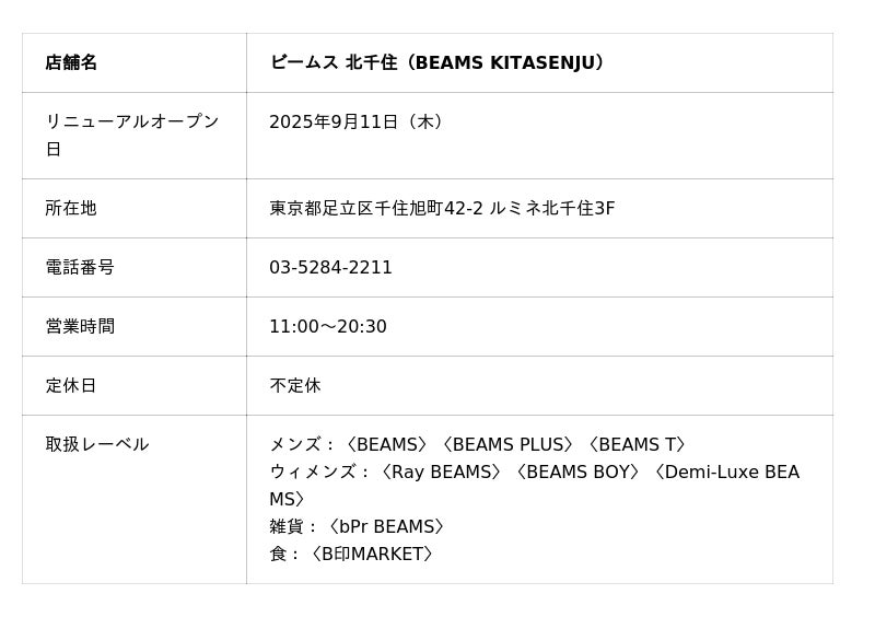 株式会社ビームス(本社:東京都渋谷区、代表取締役社長:設楽洋)は、「ルミネ北千住」に出店している「ビームス 北千住」を2025年9月11日(木)に